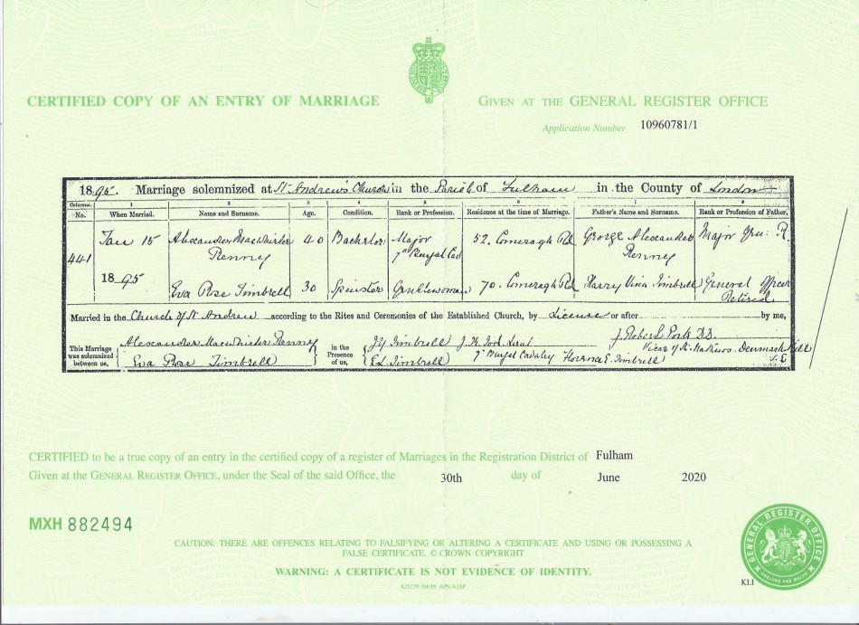 In early 1895 he married. His bride, Eva Rose Timbrell, was also from an British family in India. She had been born in the Central Provinces on 27th February 1863. He was then 40 and she was 30. Their first child, a daughter, Ellen Juliana Renny was born and baptized at Mussorie, Christ Church Bengal. Two further children were to follow, Alexander Timbrell Renny in 1904 and Rose Christine Renny in 1905.