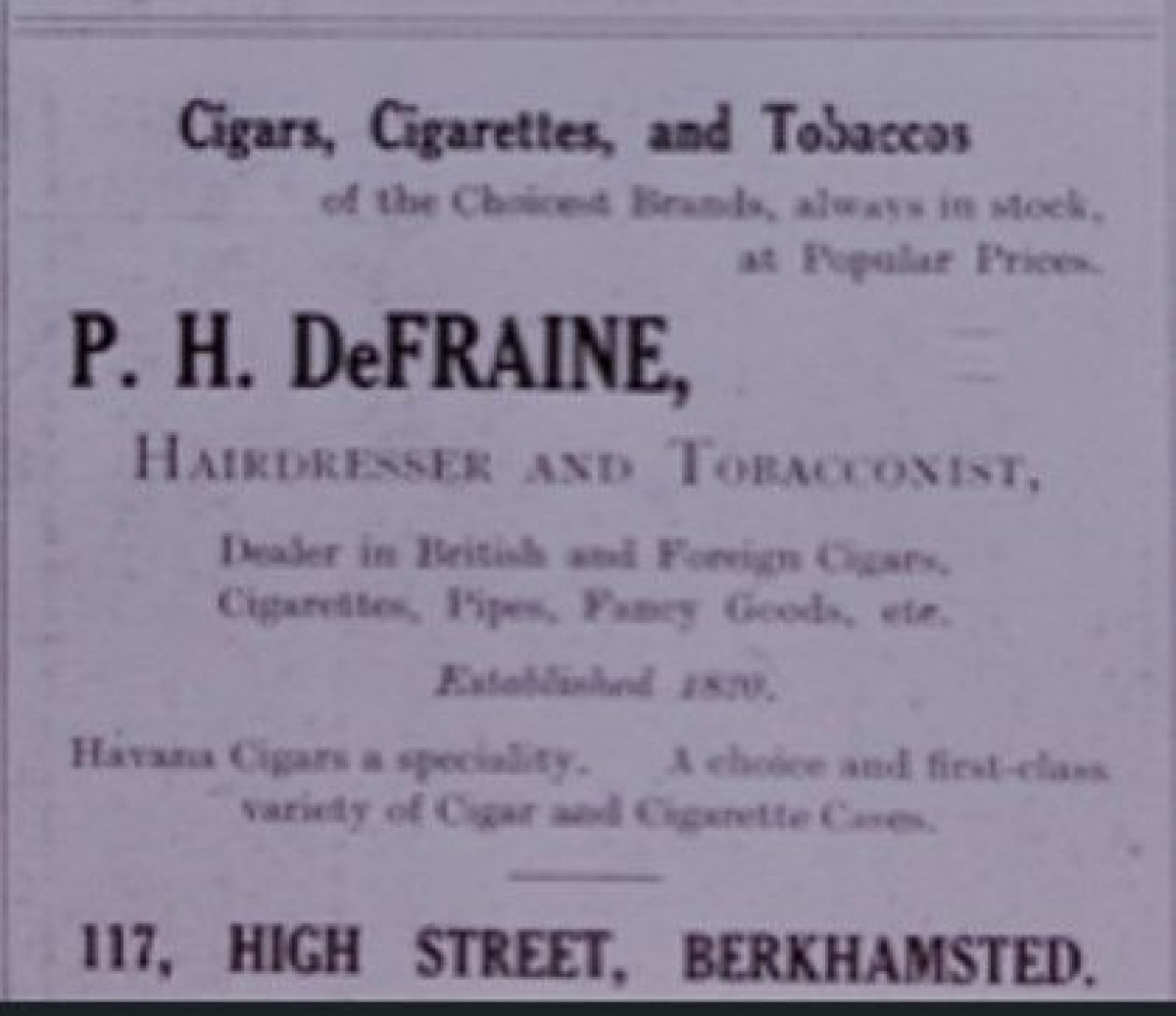 At some point after 1891, Philip’s father retired from his hairdressing business in Berkhamsted and moved to Apsley, dying in 1898. Philip moved to Berkhamsted and took over the family business at 117 High Street, becoming the third generation of the De Fraine family to cut the hair of Berkhamsted’s citizens. Philip remained at 117 High Street for the rest of his life.