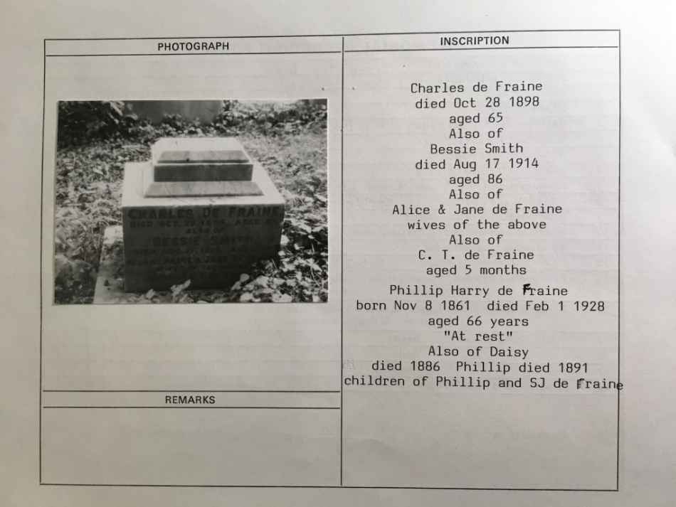 Phillip was the son of Philip and Sarah Jane de Fraine. Sadly he only lived a few months. He is buried here with his father.